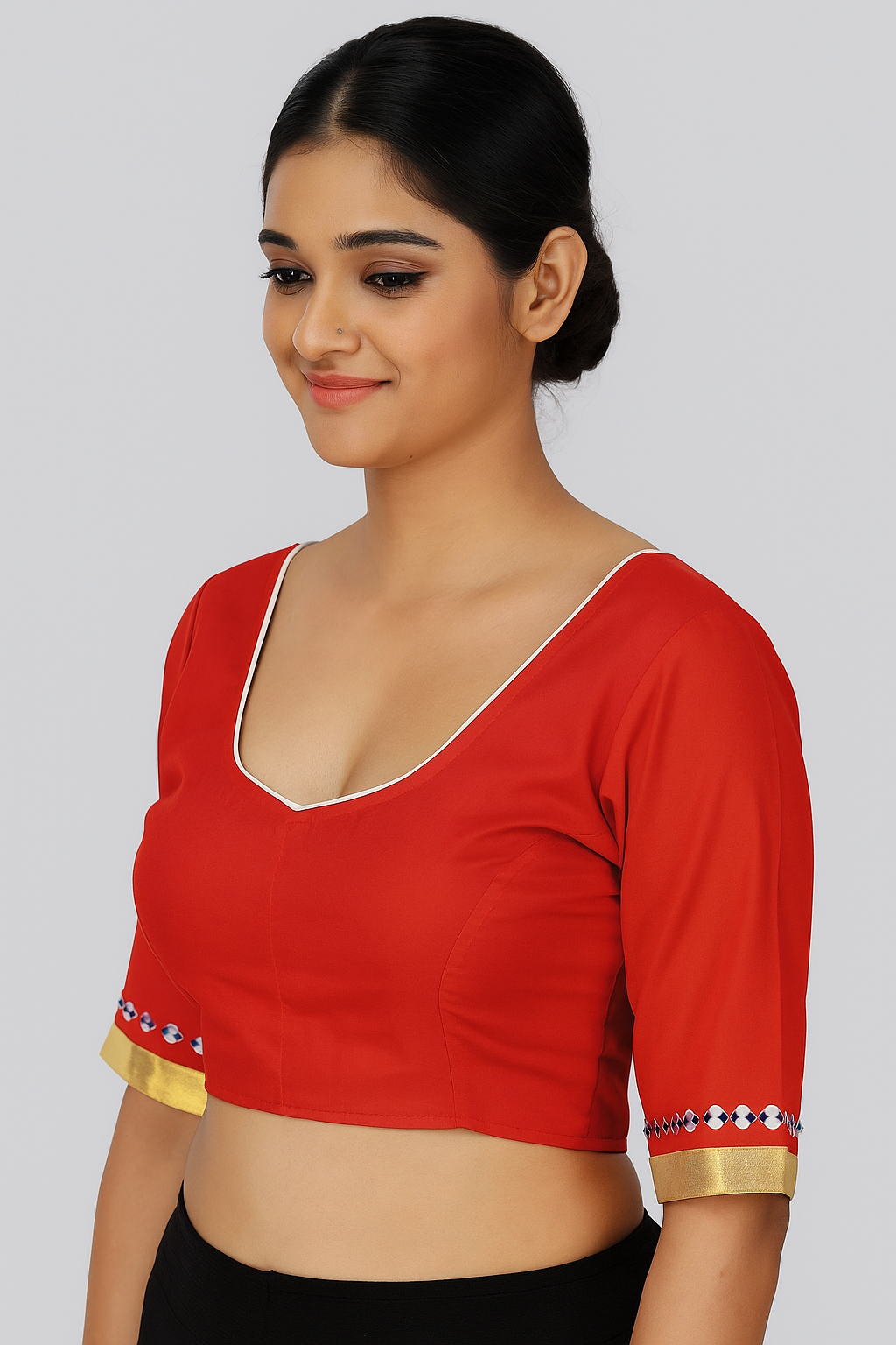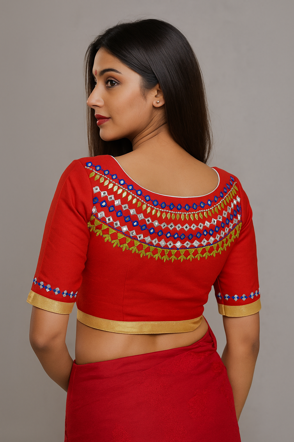 Designed with attention to detail, this blouse features exquisite handwork that reflects light beautifully, making it ideal for festive occasions, weddings, parties, and cultural events. The cotton fabric ensures a smooth and comfortable fit, allowing you to move with ease while maintaining a stylish silhouette. Its vibrant red color pairs wonderfully with sarees in contrasting or matching tones, giving you endless styling options.