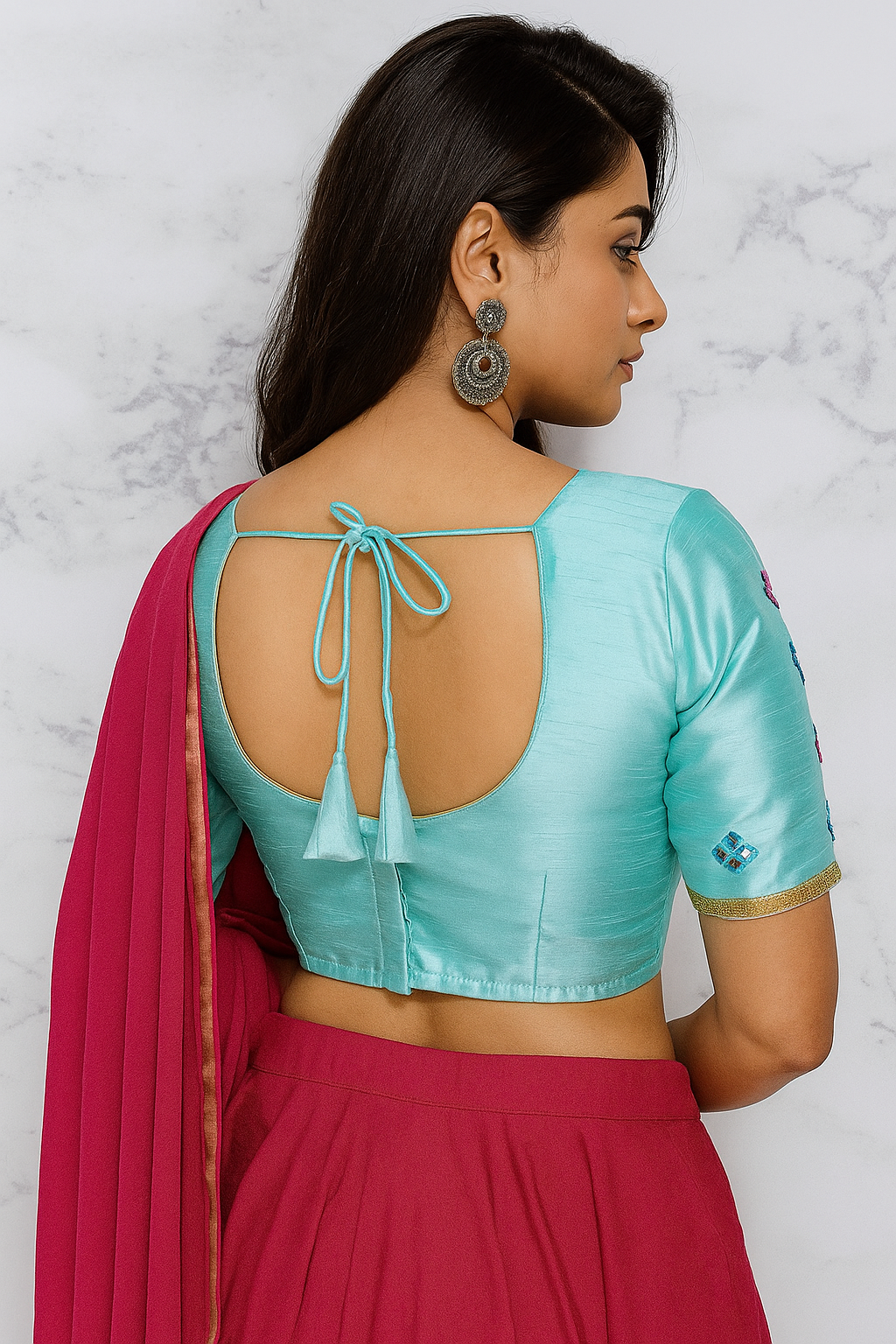 This stylish piece comes with half sleeves that offer perfect coverage while maintaining a fashionable and modern look. The fine stitching ensures long-lasting durability and a comfortable fit for all-day wear. Whether you pair it with a saree or lehenga, this blouse seamlessly complements any festive, wedding, or cultural outfit.