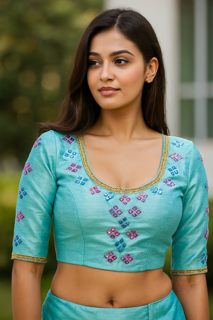 - Elevate your traditional wardrobe with this stunning Silk Mirror Design Women’s Blouse, specially crafted for a regal and festive look. Designed from premium quality silk fabric, this blouse features an elegant shine and smooth texture that feels luxurious against the skin. The beautifully hand-crafted mirror embroidery adds sparkling charm, reflecting light with every movement and enhancing your overall ethnic appearance.